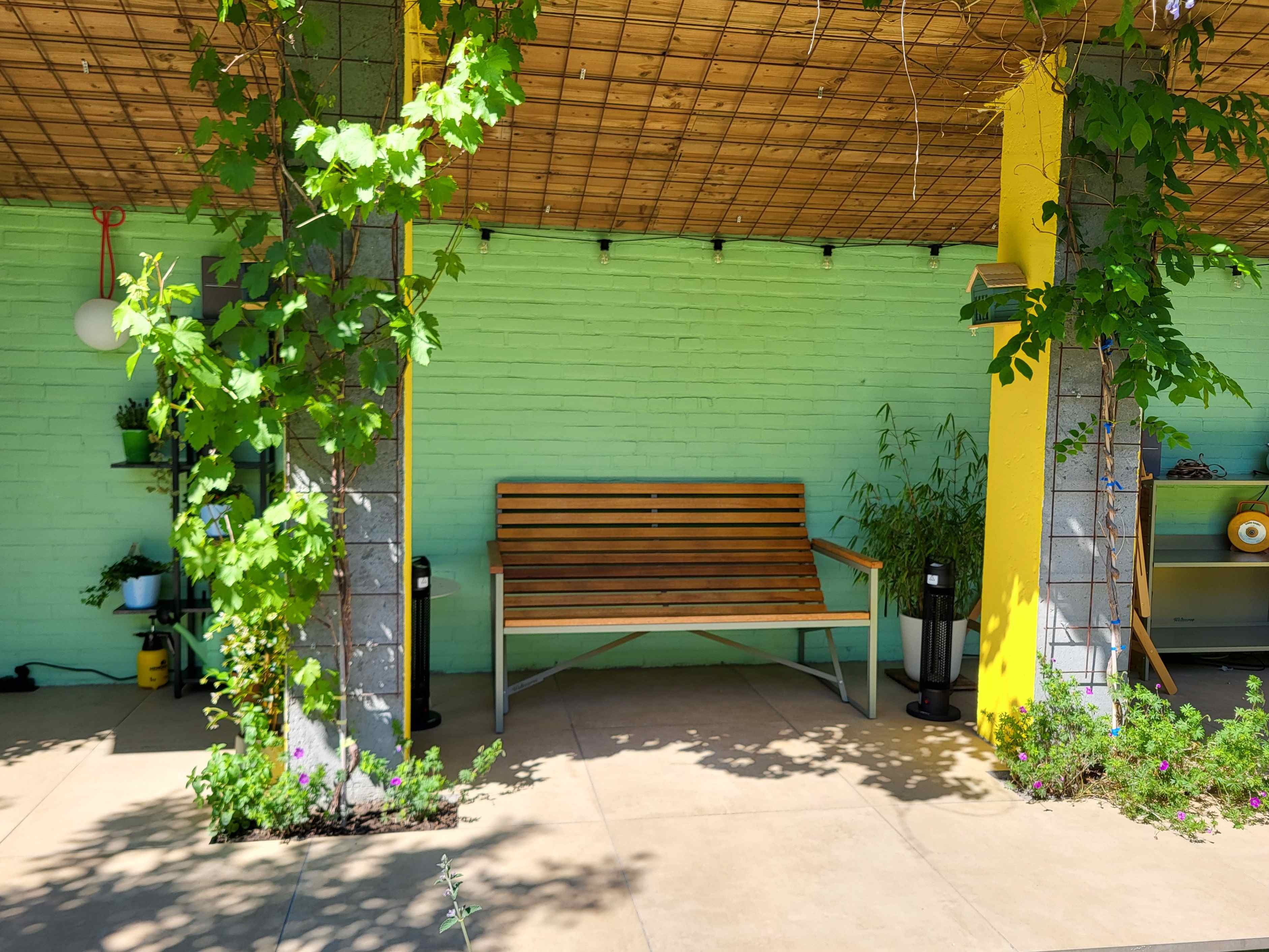 - Ik heb wel nog een overdekt zitje onder een groen-geel-geschilderde luifel, in mijn tuin, met twee kleine heaters ernaast. Daar mag u ook plaatsnemen.