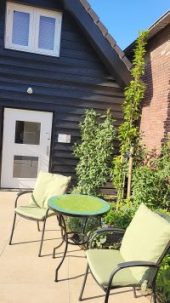 - Mijn praktijkruimte vindt u in het aparte, kleinere (vrijstaande) bijgebouw, rechts van mijn huis, achter het hekje, in de tuin – de twee bordjes met de flamingo’s wijzen de weg :-)